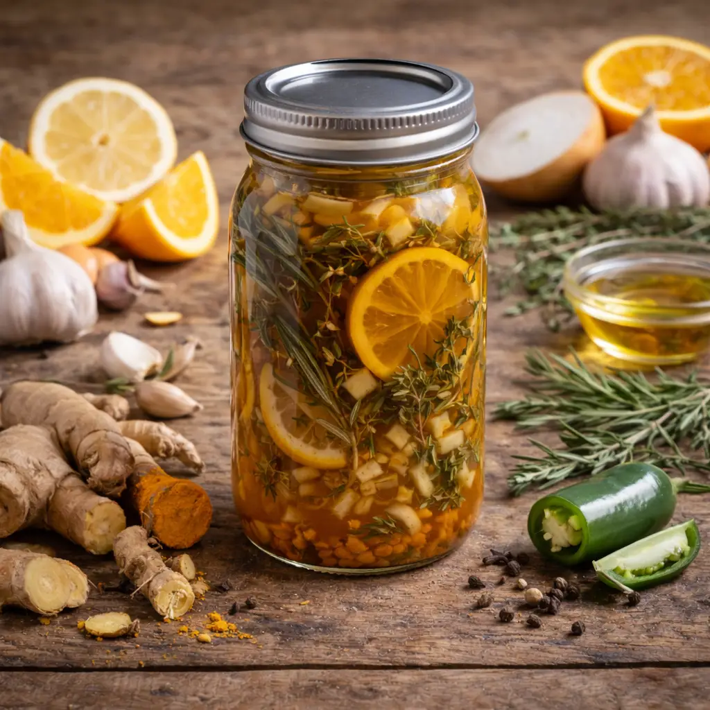 This version is slow-infused with lemon, orange, onion, garlic, jalapeño, thyme, rosemary, oregano, cloves, turmeric, ginger, and horseradish — ingredients long valued in folk traditions for their warming, stimulating, and supportive qualities. The result is a strong, invigorating tonic meant to be used regularly or as needed when immune support feels especially important.