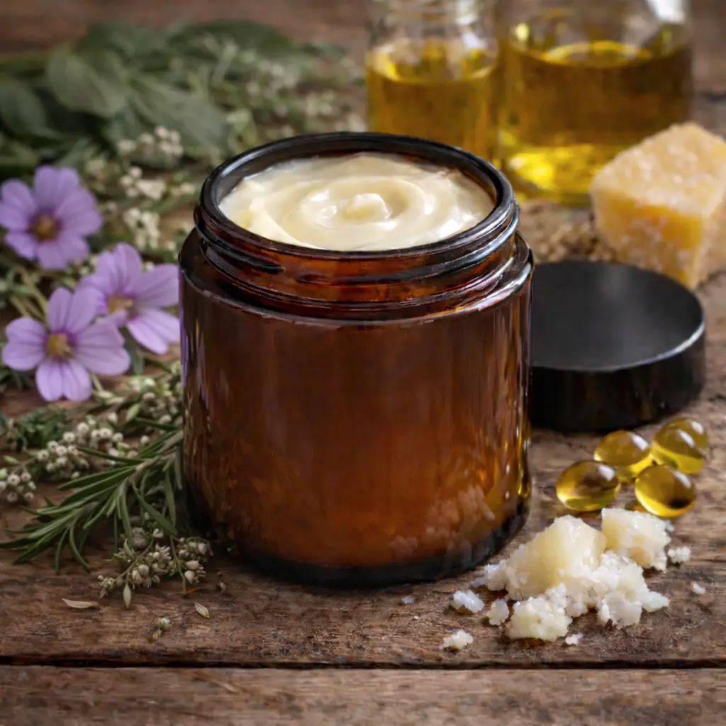 Olive oil infused with mallow, plantain, knotgrass, and rosemary, beeswax, vitamin E.